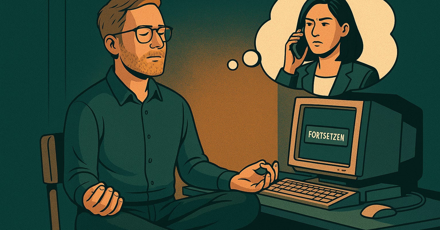 Jens Mertens wachte auf und wusste sofort: Hier war kein WLAN. Die Decke über ihm bestand aus abgehängten Akustikplatten in einem Grauton, der offiziell „Corporate Nebel“ hieß. In der Ferne brummte ein Kaffeevollautomat, der vermutlich seit drei Wochen leer war, aber aus purer Gewohnheit weiter zu leben versuchte. Jens richtete sich auf. Er sass auf einem Drehstuhl ohne Armlehnen. Kein gutes Zeichen. Als er seinen Namen in die Luft sagte, antwortete niemand. Nur ein kleiner, digitaler Lautsprecher an der Wand blinkte auf.